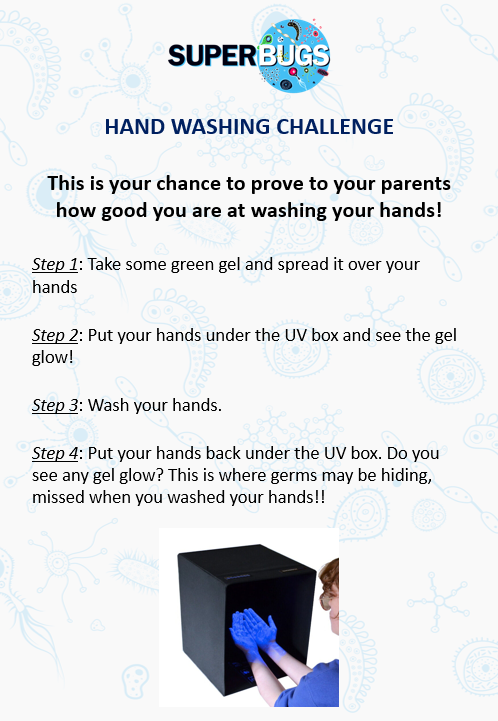 An activity to teach good hygiene - by using fluorescent gel that magically makes your hands glow in the dark.