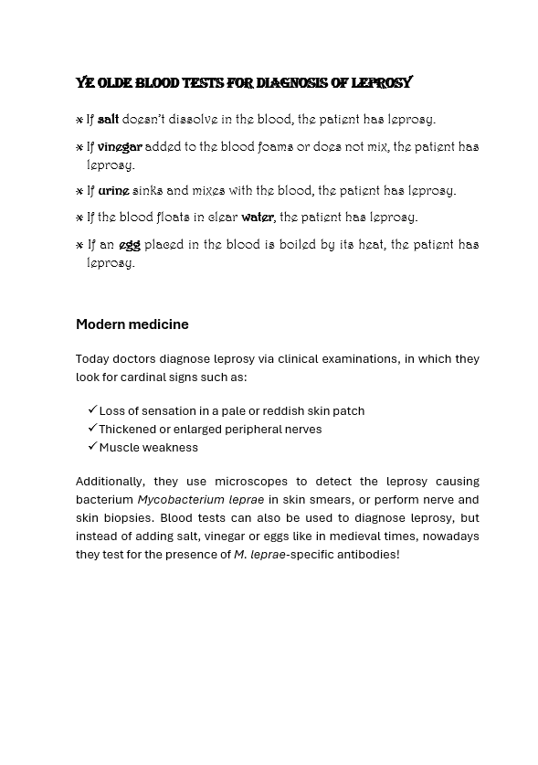 Additionally, they use microscopes to detect the leprosy causing bacterium Mycobacterium leprae in skin smears, or perform nerve and skin biopsies. Blood tests can also be used to diagnose leprosy, but instead of adding salt, vinegar or eggs like in medieval times, nowadays they test for the presence of M. leprae-specific antibodies!