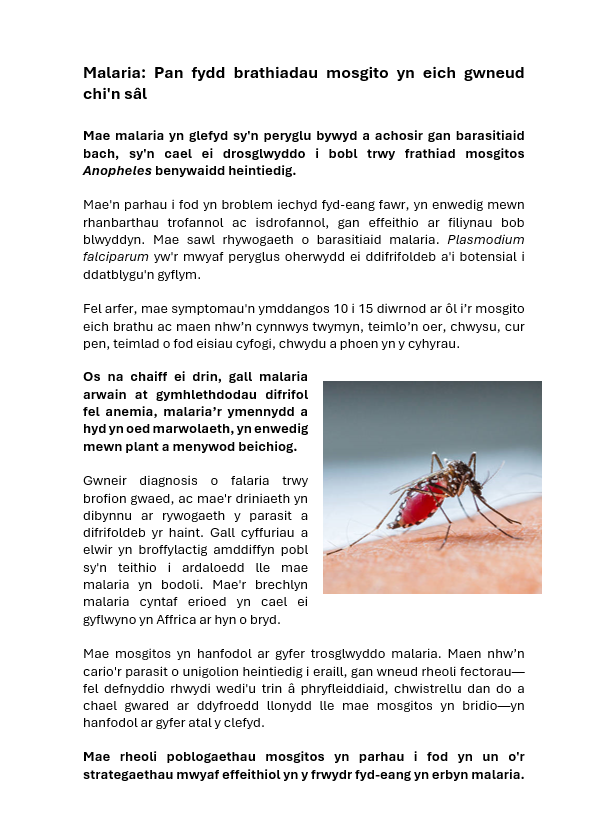 Malaria is a life-threatening disease caused by tiny parasites, transmitted to humans through the bite of infected female Anopheles mosquitoes.