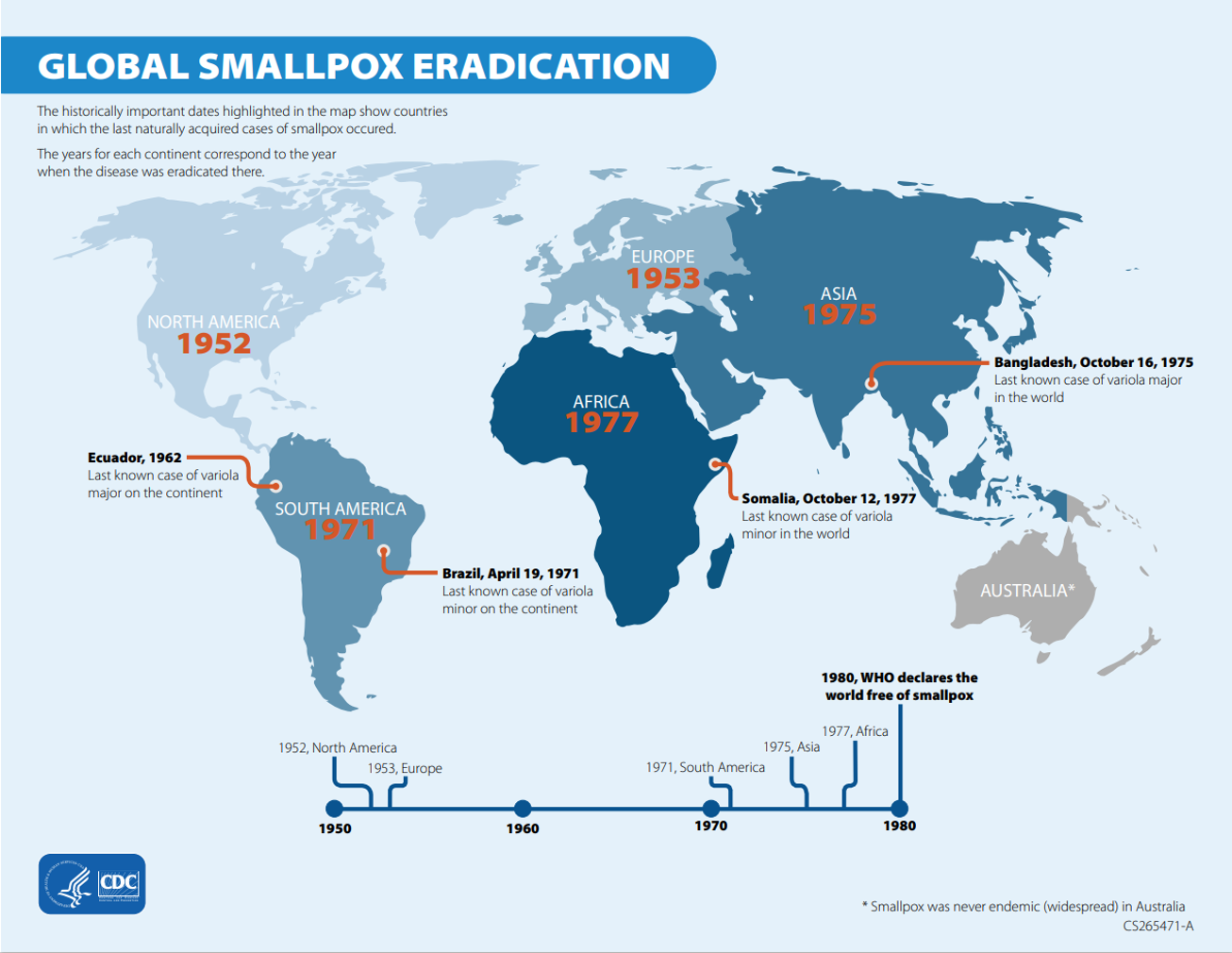 These discoveries laid the groundwork for widespread vaccination campaigns. And so one day in 1977, Ali Maow Maalin, a hospital cook in the town of Merca in Somalia, became the last person in the world to contract smallpox naturally. Ali survived and made a full recovery.